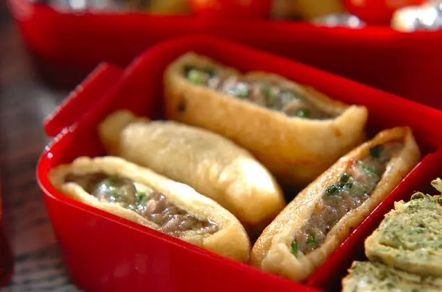 油揚げの中にひき肉あんを詰めて焼くだけ。ジュワッとあふれる肉汁を油揚げが吸い込み、香ばしくカリッと仕上がります。包む手間いらずで失敗知らず。冷めてもおいしいので、お弁当にも最適です。