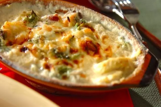里芋の自然なとろみを活かして、小麦粉なしでもホワイトソースが作れます。短時間の煮込みで、隠し味のみそが深いコクをプラス。焼き上がりの香りが食欲をそそる一品です。