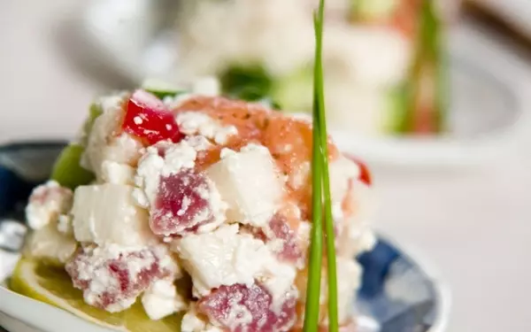 あっさりとしたカッテージチーズとマグロ、長芋などを和え、明太子ドレッシングをかけるデリ風の前菜です。甘酢を効かせた爽やかなドレッシングに、明太子の辛みが小気味良いアクセントに。おしゃれに盛り付ければ、パーティーやおもてなしの食卓を華やかに演出できます。