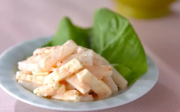 鍋もレンジも使わない、大根の明太和え。みずみずしい大根にチーズのコクがよく合いますよ。明太ダレは、プレーンヨーグルトやマヨネーズのまろやかさと、隠し味のしょうゆが好バランス。シャキシャキ、ポリポリとした食感が後を引きます。