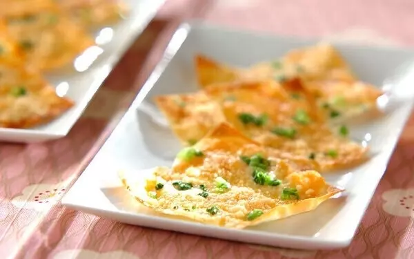 マヨネーズと明太子、ガーリックパウダーで作ったソースをワンタンの皮に塗ると、粉チーズの風味が香ばしいおつまみに。包む手間がいらないので、10分あれば出来上がり。トースターでパリパリに焼けた皮の食感が楽しく、子どもも喜ぶスナック感覚の副菜です。