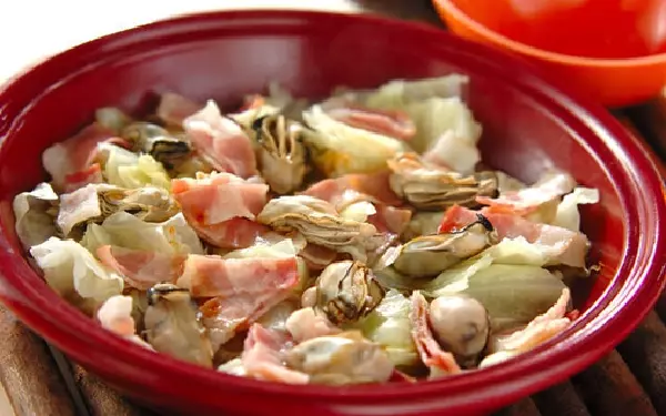 カキとベーコンは相性抜群の王道コンビ。カキの旨みとベーコンの塩気、キャベツの甘みがあるので、少量のしょうゆだけで味がばっちり決まります。最後の蒸し汁までしっかりとおいしい一品です。