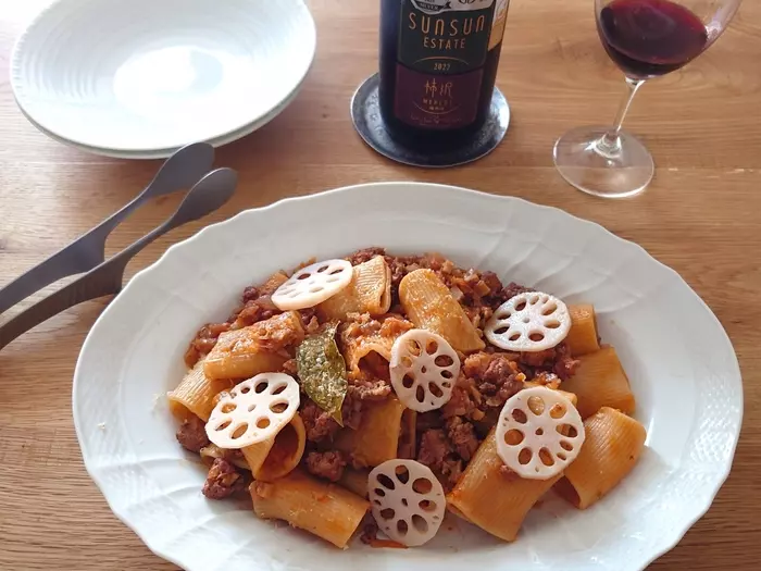 秋の煮込みパスタ「レンコンミートソースのパッケリ」日本の赤ワインと楽しむ【ワインと料理 ペアリングの愉しみ】