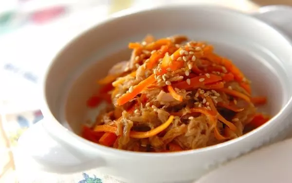 ニンジン・ツナ・ナメタケでサッと作れる、きんぴら風のお手軽副菜です。ナメタケに塩味があるので、みりんを加えて炒め合わせればOK。冷蔵庫に残っている野菜をプラスしたアレンジも自在です。