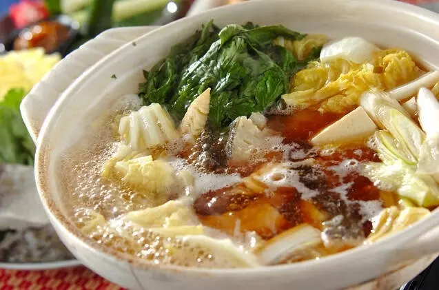 カワハギなどの白身魚とイカ、ホタテから出る旨みたっぷりのスープがくせに! 白菜やシイタケも入れるため、食べ応えも抜群です。〆はうどんや雑炊がおすすめ。