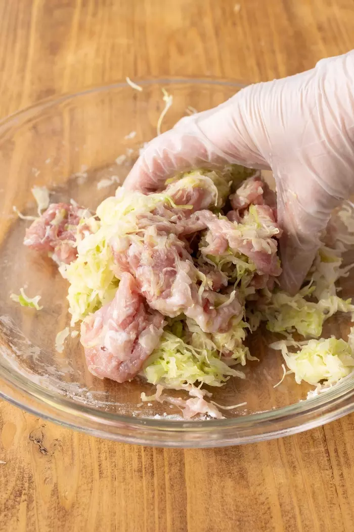 2、1に豚肉と〔A〕を加え、よく混ぜて丸める。