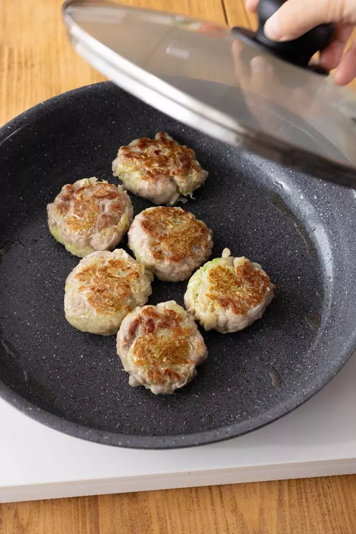 4、焼き色がついたらふたをして弱火で7〜8分蒸し焼きにし、好みでポン酢をかける。