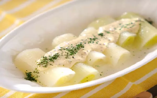 白ネギは焼くだけでなく煮ても美味です。こちらのレシピでは、塩・ニンニク・オリーブオイルを入れた水で白ネギを煮込み、マスタードソースをかけて仕上げます。酸味の効いたソースと甘い白ネギのハーモニーをお楽しみください。