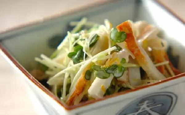 少量のしょうゆを加え、和風テイストにするのがポイント。白ネギは繊維に沿ってせん切りし、電子レンジで加熱するだけでOKです。ちくわや貝われ菜などが味に深みを与えます。すりおろしたユズ皮の香りにより、後味爽やか。