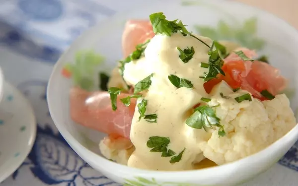 白とピンクのコントラストがきれいな、食卓を彩るおしゃれサラダ。カリフラワーを茹でるときに少量の酢を入れると、変色しにくく、鮮やかな白さを保てます。マヨネーズベースのドレッシングは、マスタードの風味がアクセント。グラタンやフライなどの洋食に添える副菜としていかがでしょうか。