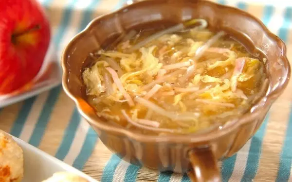 トロミのあるかき玉スープに、モヤシ1袋を加えてボリューム満点! モヤシは食感が残るよう、サッと煮る程度でOKです。手軽な材料でコスパ良く作れます。小腹が空いたときにも最適です。