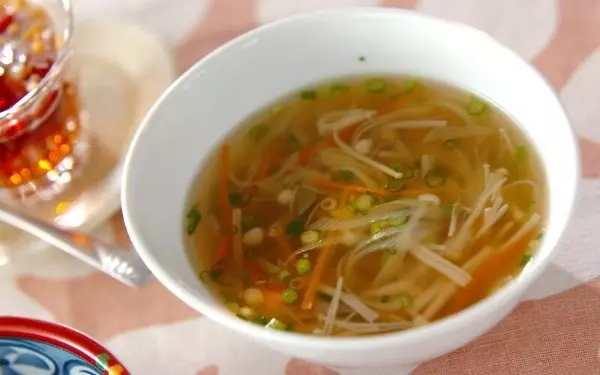 エノキ、ニンジン、ネギのシャキシャキとした食感がくせになります。エノキの旨味がスープに溶け出し、やさしい味わいです。たっぷりの野菜は煮込むことでカサが減るため、ペロリと食べられます。