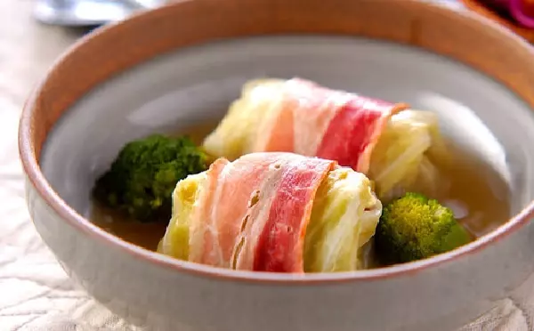 ベーコンを巻くのがポイントな定番のロールキャベツ。ベーコンの旨みが加わり、深みのある味わいに。玉ネギやブロッコリーも一緒に煮込むので、野菜がたっぷり食べられるのもうれしいですね。初心者にもおすすめの一品です。