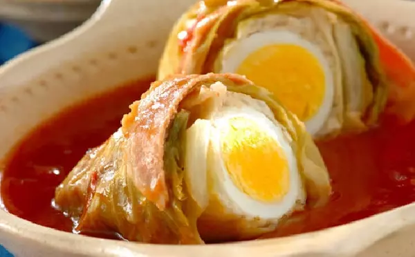 ゆで卵を丸ごと1個入れる、ユニークなロールキャベツです。切ったときの断面が美しく、食卓で映えします。タネには鶏ひき肉を使うので、あっさりとした味わいです。煮汁にはトロミをつけるので、体の芯から温まりますよ。