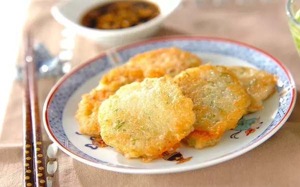 ジャガイモだけで作るシンプルなチヂミは、どんな主菜とも相性が良いのが魅力。モチモチ感がやみつきになりますよ。小さめに丸く焼いたら、裏返す前にネギと赤唐辛子をトッピング。ピリッとした辛みがアクセントになり、お酒が進むこと間違いなしです。