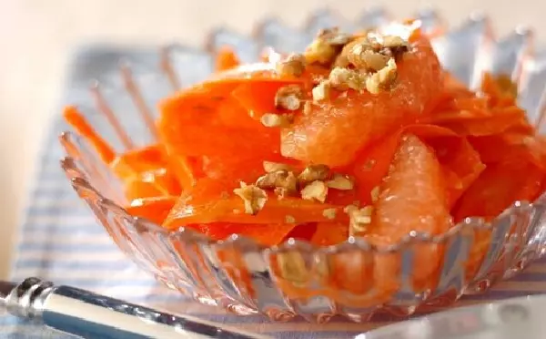 リボンのような見た目がかわいらしいサラダです。ニンジンは火を通さないので、ビタミンを余すところなく摂取できるのが魅力。クルミは軽く煎ってから散らすと、香りが引き立ちますよ。