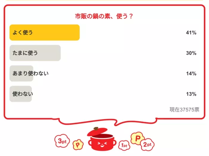 - 「市販の鍋の素、使う?」<回答数37,575票>【教えて! みんなの衣食住「みんなの暮らし調査隊」結果発表 第396回】