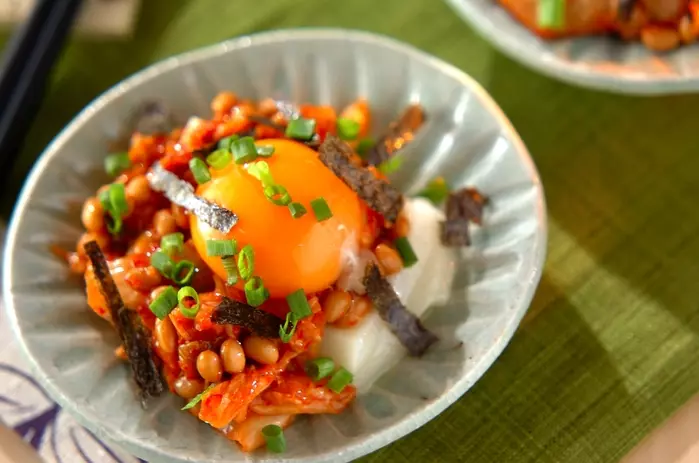 2、お餅を器に盛り、混ぜ合わせた白菜キムチと納豆をかける。卵黄をのせて、刻みネギ、もみのりを散らし、しょうゆをかける。