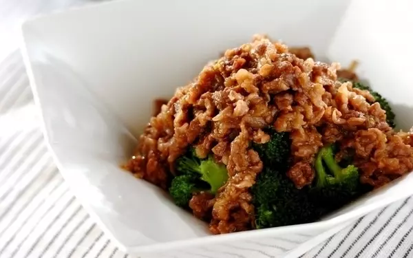 「野菜だけでは物足りない」という日におすすめ。ビタミンC豊富なブロッコリーをまるごと一株使い、甘辛い牛肉みそをたっぷりと。ブロッコリーに不足しがちな鉄分や亜鉛を牛肉で補う、理に適った組み合わせです。おかずとしてはもちろん、お酒を控えたい晩酌代わりのメインディッシュとしても重宝しますよ。