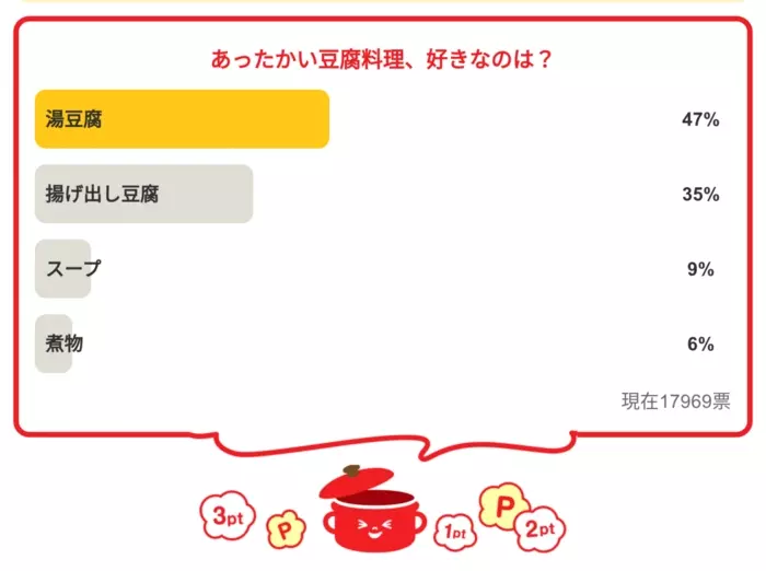 今日の質問は「あったかい豆腐料理、好きなのは?」さてみなさんの回答は…?
