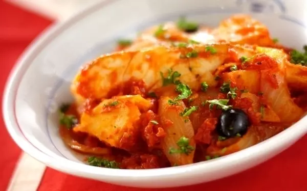 あっさりとしたタラに、トマトの濃厚な旨みがしみ渡る絶品煮込み。身が崩れやすいタラは、最後に加えるのがきれいに仕上げるコツです。ジャガイモや玉ネギの自然な甘みが加わり、魚料理が苦手な子どももパクパク食べられます。