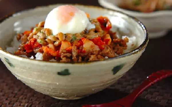 納豆+キムチの発酵食品コンビで、健康や美容にも良い効果が期待できる、スタミナ満点の丼料理。上にのせた温泉卵をホロホロに崩し、全体にからめるように混ぜてから食べると、キムチの辛さが和らぎます。