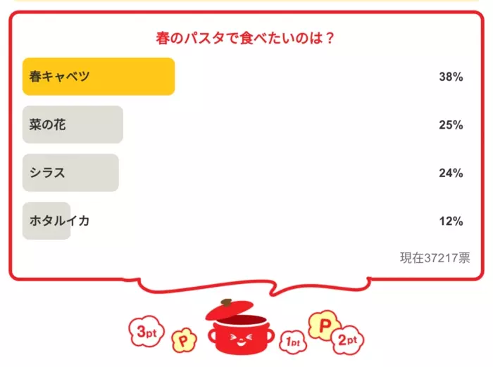 今日の質問は「春のパスタで食べたいのは?」さてみなさんの回答は…?