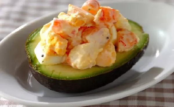 種を除いたアボカドにエビマヨを盛りつけた、オシャレな一品。エビは殻付きのまま白ワインとともに電子レンジで蒸し焼きにするため、プリプリ食感に。側面のアボカドを崩しながら混ぜて食べると、まろやかさが増します。