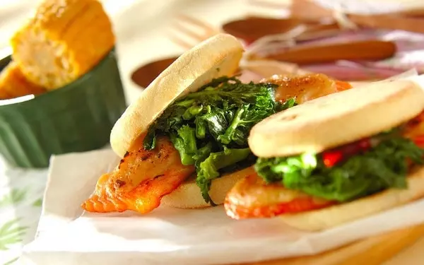 いつもの食パンをイングリッシュマフィンに代えるだけで、グンとおしゃれな雰囲気に! 白みそを塗った鮭と、ほろ苦い菜の花のガーリックソテーをサンドする、食べ応えのある一品です。和風の味付けなので、ごはん派の方にも大好評。ピクニックシートの上でも片手でパクっと食べやすいです。