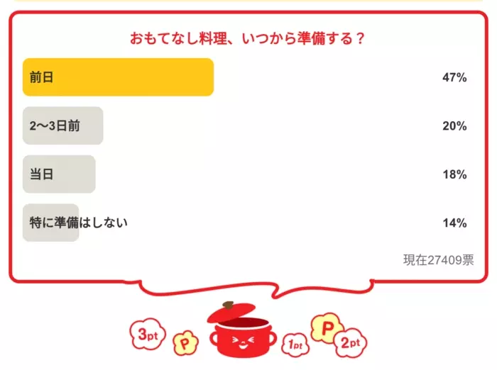 そして3位は「当日」。パパッと作れて、できたてを振る舞いたいという意見も一定数ありました。4位は「特に準備はしない」。無理せず、その場で気軽に楽しむスタイルも支持される結果に。前もって準備しておく人が多い一方で、それぞれのスタイルでおもてなしを楽む様子がうかがえます。