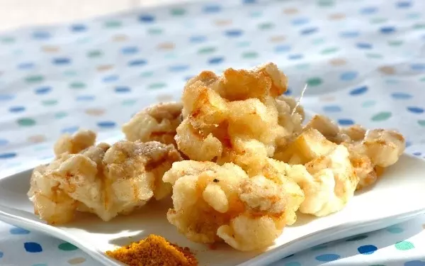 鶏もも肉とタケノコを角切りにし、衣でまとめてスプーンで落とし揚げにするのがコツ。食べやすいサイズ感ながらボリュームもあり、満足感の高い一品です。スパイシーなカレー塩が素材の旨味を引き立てます。
