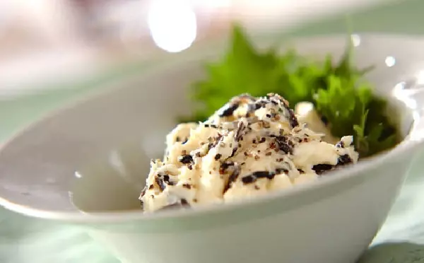 1、クリームチーズに粗びき黒コショウを全体にかけ、かつお節を全体にからめる。しょうゆをかけてサッと混ぜ合わせ、器に盛る。