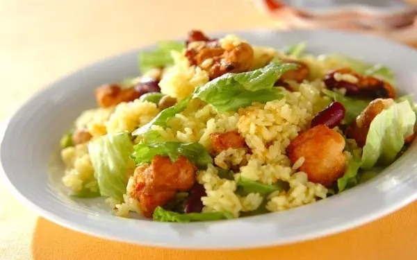 スパイシーなタンドリーチキンとターメリックライスを合わせた一皿。ご飯にカレーの風味がしみ込んで、やみつきになるおいしさです。ミックスビーンズやレタスの食感がアクセント。最後まで飽きずに食べられます。