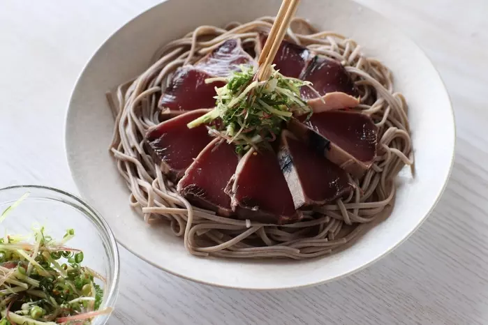 3、器にそば、カツオのたたきを円を描くようにのせ、<香味野菜>を中央にのせる。