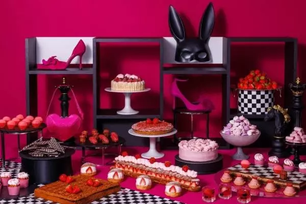 また会場は、ビビッドピンクを基調としたビュッフェ台と、白と黒で統一された空間に。兎年にちなんで、ラビットの装飾やスタイリッシュなチェック柄もアクセントとして取り入れられている。