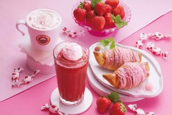 サンマルクカフェと、サクマ製菓のキャンディ「いちごみるく」が初のコラボレーション。福岡県産あまおうの甘酸っぱい味わいと、可愛らしいピンクの色合いが春の訪れを感じさせる、フード&ドリンク全3メニューを展開する。
