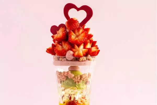 ウェスティンホテル大阪「恋みのりいちごパフェ」“ハート形チョコ”を添えた苺尽くしパフェ