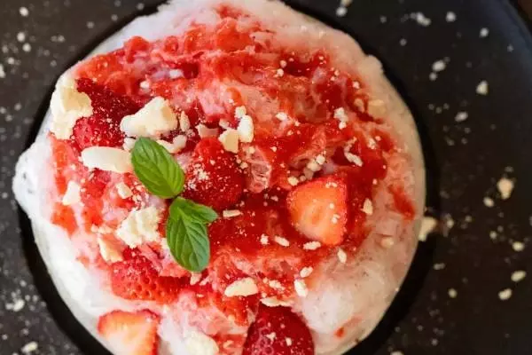 看板メニューは、ジューシーで甘酸っぱい苺の味わいを堪能できる「完熟生苺とメレンゲ」。苺には一切火を入れず、フレッシュなまま潰してシロップにすることで、果実感たっぷりの贅沢な味わいを実現した。ひと口食べれば、軽い口あたりの氷と、ごろっとした完熟苺、サクサク食感のメレンゲが織りなす、上品なハーモニーを楽しめる。