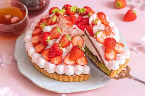 「紅ほっぺとさくらのタルト」は、甘みと酸味のバランスが絶妙な静岡県産の苺「紅ほっぺ」とさくらのハーモニーを楽しめるタルトだ。大納言あずき入りの抹茶ケークタルトに、グリオットチェリージャムやさくらのクリームを重ねた、“和テイスト”な1品となっている。