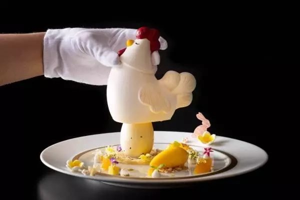 「ガストロノミー“ジョエル・ロブション”」では、ニワトリが巣で卵を産んだ様子をイメ―ジしたデザートを用意。チョコレートで出来たニワトリの中には、柑橘のマーマレードやココナッツムースを閉じ込めた卵をセット。ニワトリを持ち上げると卵が出てくる、遊び心あふれるユニークな1皿となっている。