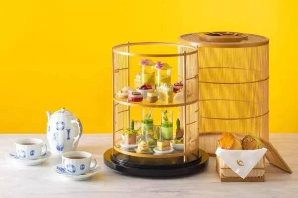 優美な竹細工によるティースタンドには、パイナップルを主役にしたタルトや、口溶けなめらかなグレープフルーツムース、マンゴーとピスタチオのケーキ、ジューシーなメロンのグラスデザートなど、見た目にも華やかなスイーツがラインナップする。