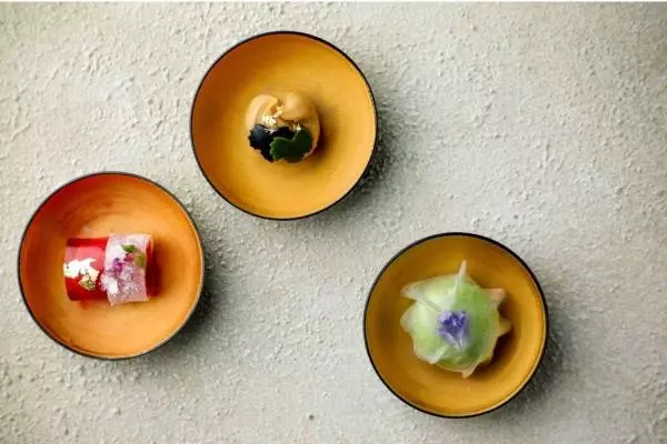 琳派を大成させた尾形光琳の作品《蔦図香包》をモチーフに、松野醬油の醤油のガナッシュクリームを中村製餡所のこし餡で包んで練り切りで仕上げたスイーツや、琳派の奇才・鈴木其一の《藤花図》をイメージし、白餡で包んだ葡萄とクリームチーズを大原の紫蘇ジュースの寒天と求肥で巻いたスイーツなど、琳派らしさを散りばめたスイーツが並ぶ。
