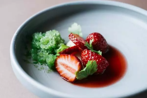 「レストラン カジ」では、カリフォルニア料理からインスパイアされたオリジナルメニューからなるコース料理を用意。「セビーチェ」や「スダチとアヒアマリョ(黄唐辛子)をあえた甘エビ・ペルー産黄芋のロースト添え」といった品々を、日本の魚介類や地元の食材を用い、革新的にアレンジして提供する。また、薪窯を使って食材の繊細な味わいに深みを加えているのもポイントだ。