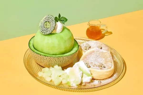 使用されるメロンは、まろやかな甘さが特徴で、香りも良いジューシーな国産タカミメロン。メロンのまんまるなビジュアルはそのままに、くり抜いたメロンの中にジャスミン茶が香るゼリーとババロア、レモンピール入りソルベを忍ばせた。
