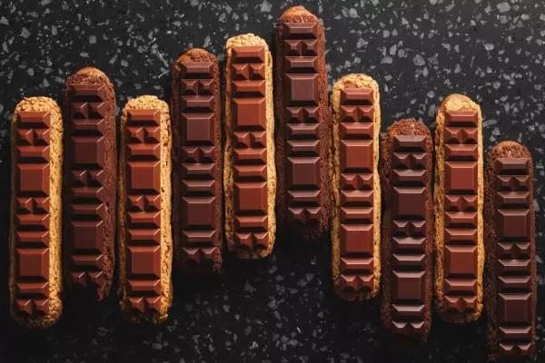 ル・ショコラ・アラン・デュカスから展開される2種類のエクレアは、サクサク食感のクランブルを乗せて焼き上げたシュー生地に、幾何学模様のショコラを大胆にトッピングしたスイーツ。