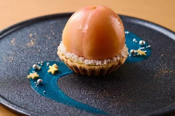 夏限定のケーキ「桃に願いを。」は、“大きな桃が、天の川を流れてきたら”という、ファンタジックな世界観を表現した1品。星が輝く天の川をモチーフにしたプレートに、桃を丸ごと1玉使用した華やかなケーキをセットしている。