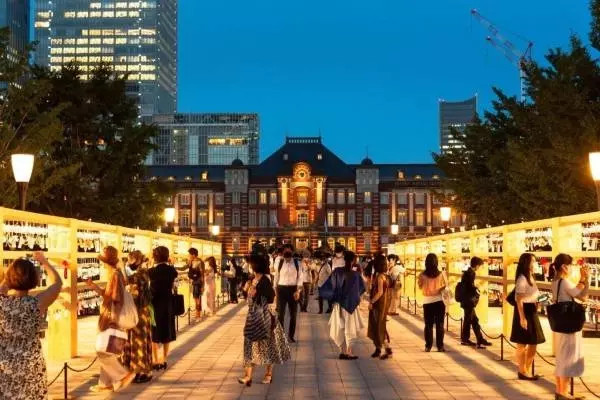 まず最初の週に開催される「丸の内 納涼まつり」では、“江戸の夏の景色”をコンセプトに、風鈴1,020個を行幸通りに展示。東京駅丸の内駅舎をバックに、夏の風物詩のひとつである風鈴の音を楽しむことができる。