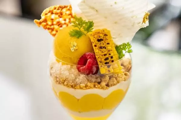 上品な甘みのとうもろこしジェラートと、香ばしいほうじ茶ジェラートの絶妙なマリアージュに始まり、シャキシャキとした焼きとうもろこしのトッピングやライムメレンゲ、パリパリのアーモンドチュイールが楽しい食感を演出。