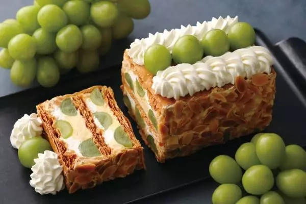 丸ごと贅沢に使用したシャインマスカットの果肉を、コクのあるクレーム・シャンティに加え、カスタードクリームと生クリームを合わせたディプロマットクリーム、サクサクのパイ生地と重ねた“ミルフィーユ仕立て”に仕上げた。