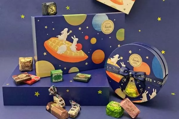 「オータムコレクション」は、宇宙空間でカカオポッドのボートに乗ったうさぎがムーンリバーで遊ぶ、キュートでちょっぴり大人っぽいデザインのチョコレートギフトボックス。惑星を眺めたり、星に触れたりするうさぎが可愛らしく描かれている。